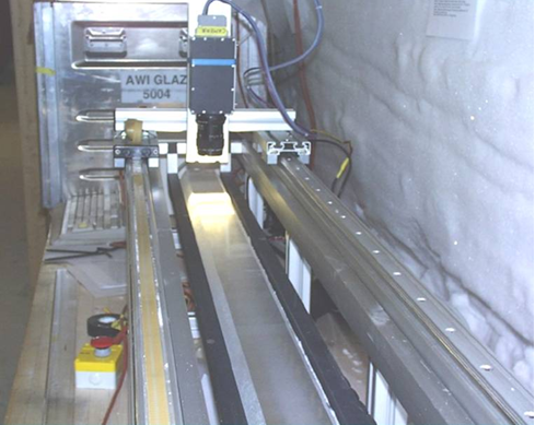 Billedet viser linescanneren, som dokumenterer de synlige lag i iskernen. Lyset fra lyskilden under prøven spredes af cloudy bands og bobler i isen, og opfanges af kameraet. Lyskilden og kameraet bevæger sig synkront hen langs det 1,65 m lange stykke iskerne.